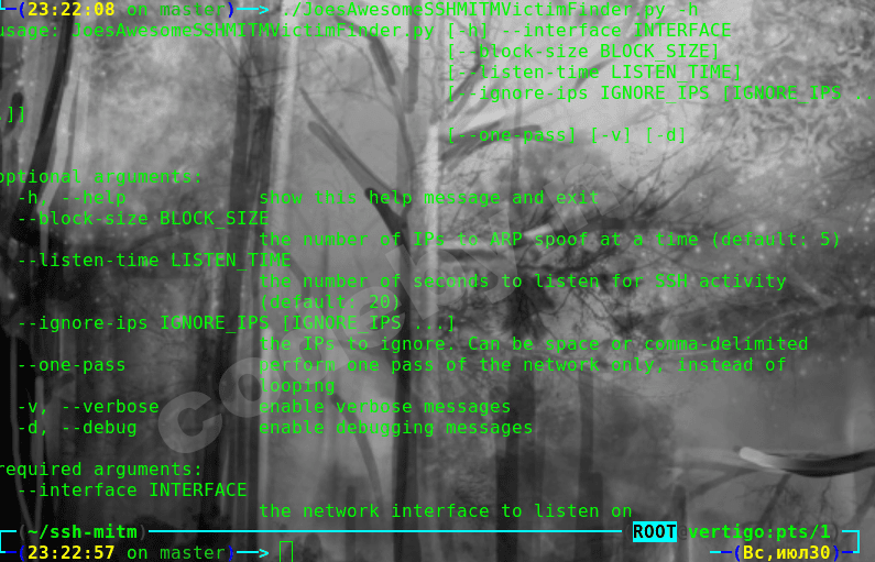 # ./JoesAwesomeSSHMITMVictimFinder.py -h -вывод справки запуска сценария поиска целей