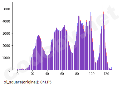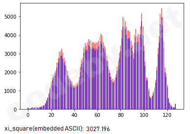Я использовала атаку гистограммы на изображение со встроенным текстом ASCII (LSB-метод) и нашла значение хи-квадрат. Изображение заполнено полностью. Оранжевый цвет - наблюдаемые частоты, голубой - ожидаемые. Все наблюдаемые частоты больше ожидаемых частот, что характерно для пустого изображения, и имеют почти одинаковую разницу. Кроме того, p-значение слишком велико для непустого стегоконтейнера, хотя данные встроены. Почему мы наблюдаем такое явление?