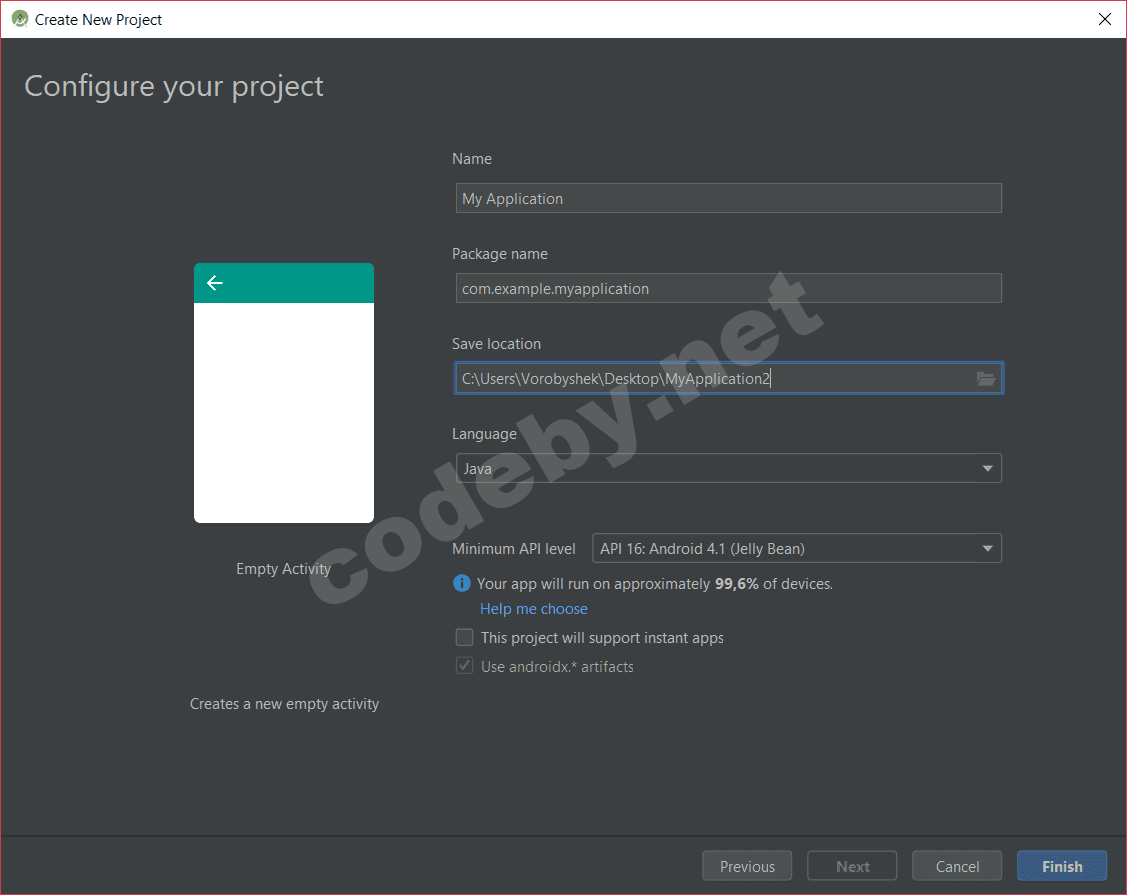 Я надеюсь что те кто хочет написать или писал приложения для Android уже установили AndroidStudio (в теории и Eclipse бы подошел, но автор пишет в AS так что будьте добры, не злитесь, если вдруг что-то из моих действий не вышло сделать в среде Eclipse), поэтому приступаем к созданию пустого проекта. Выбираем свое название, выбираем минимальную версию SDK 16 и язык разработки Java, жмем "Finish".