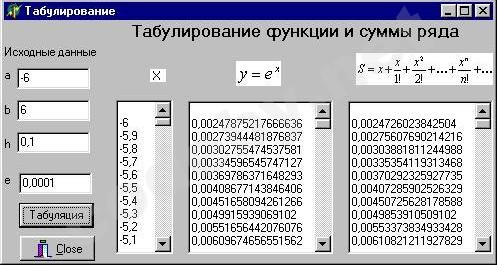 Табулирование функции и суммы функционального ряда