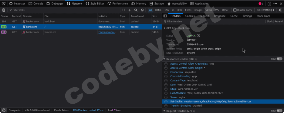 И пытаемся его выполнить в нашем браузере и видим в запросах успешно вернувшийся ответ от bank.com, который содержит наши cookie