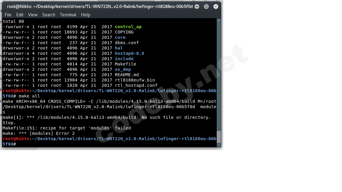 make ARCH=x86_64 CROSS_COMPILE= -C /lib/modules/4.14.0-kali3-amd64/build M=/root/Загрузки/TL-WN722N_v2.0-Ralink/rtl8188EUS_linux_v4.3.0.8_13968.20150417 modules