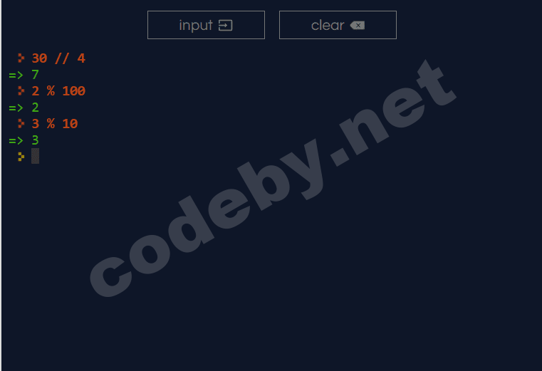 // - Возвращает только целую часть при делении. В нашем случае при делении 30 на 4 целое число это 27.