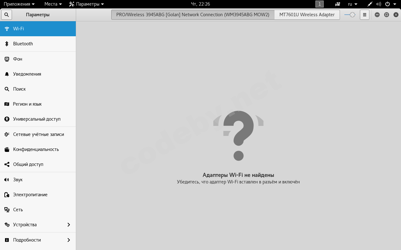 Так же свистулька до этого времени отображалась в NetworkManager, но при нажатие ползунка включения, ничего не происходило, совсем(оставалась надпись "Адаптеры WiFi не найдены"). После попыток установки драйверов он и вовсе пропал.