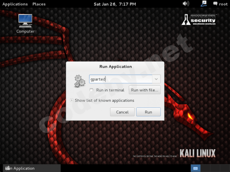 - Теперь запустите утилиту gparted. Мы воспользуемся gparted для того, чтобы уменьшить существующий раздел с Windows и освободить достаточно места для остановки Kali Linux.
