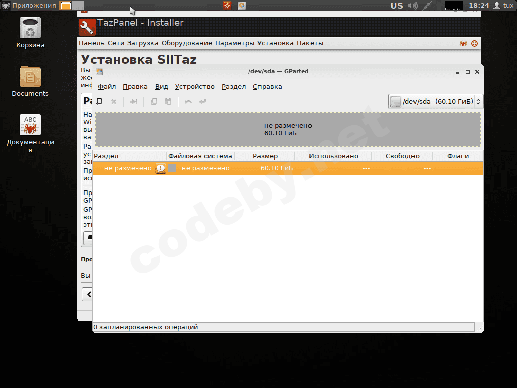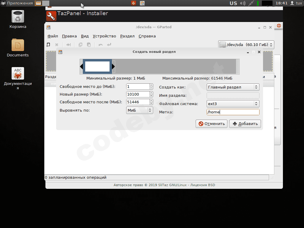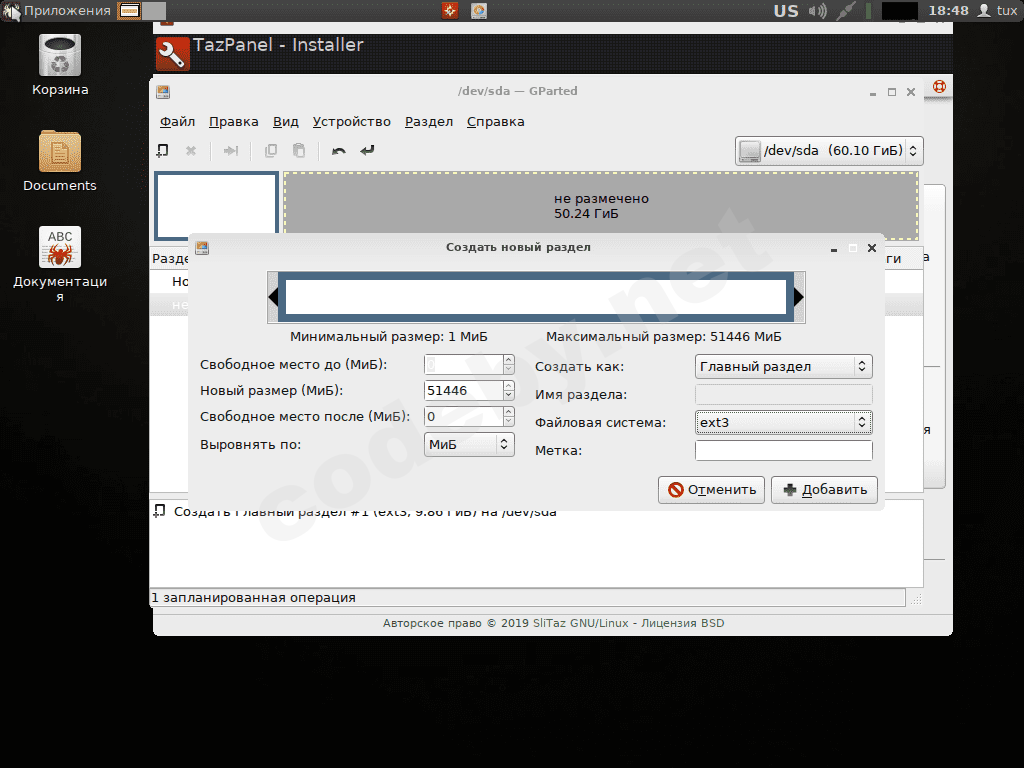 Далее в меню программы Gparted "Правка -> Применить все операции", подтверждаем о своём решение создать новую таблицу, закрываем программу Gparted и переходим к установке системы SliTaz.