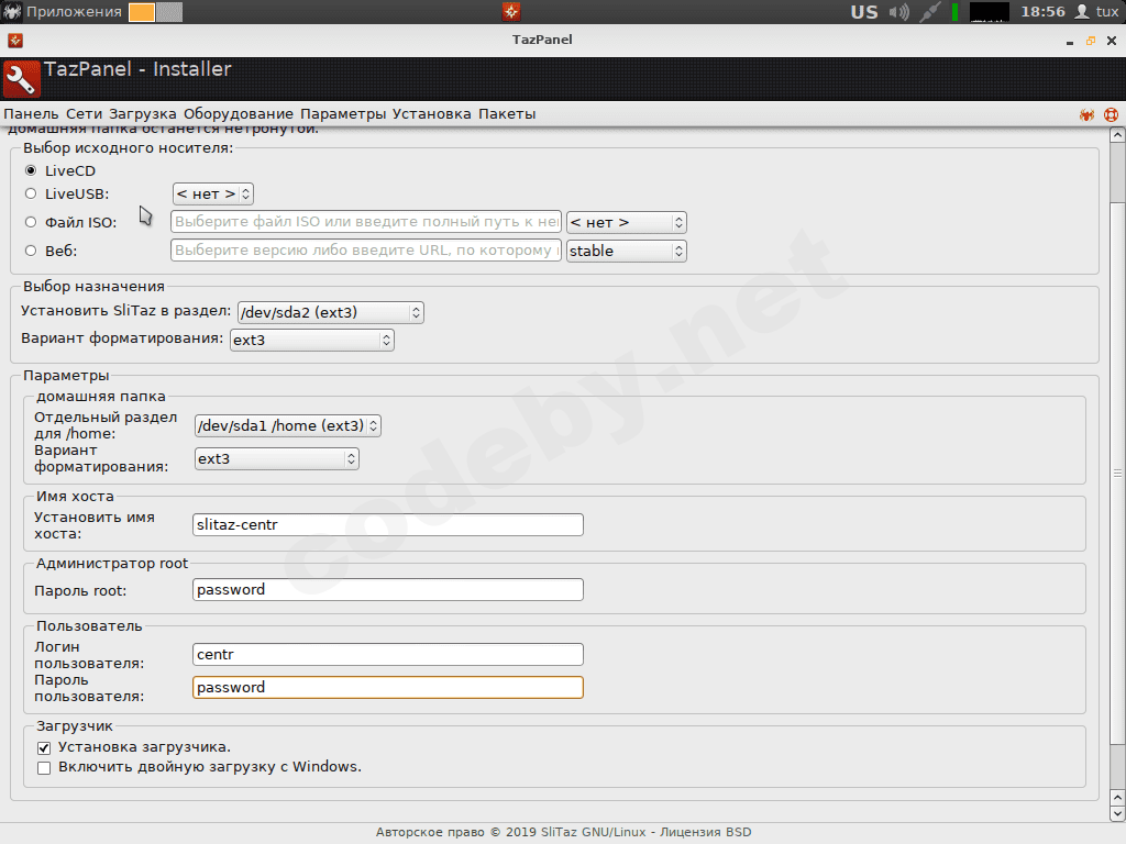 В установщике нажимаем "Установка SliTaz" - > "Продолжить установку" и настраиваем всё так же как на скриншоте расположенном ниже, за исключением "Имя хоста", "Пароль администратора", "Имя пользователя", "Пароль пользователя".