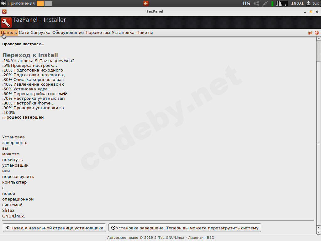 Нажимаем на кнопку "Перейти к установке" или "Начать установку", ждём окончания установки которая займёт примерно 2 минуты( или даже меньше), извлекаем примонтированный образ SliTaz и нажимаем на кнопку "Установка завершена. Теперь вы можете перезагрузить систему."