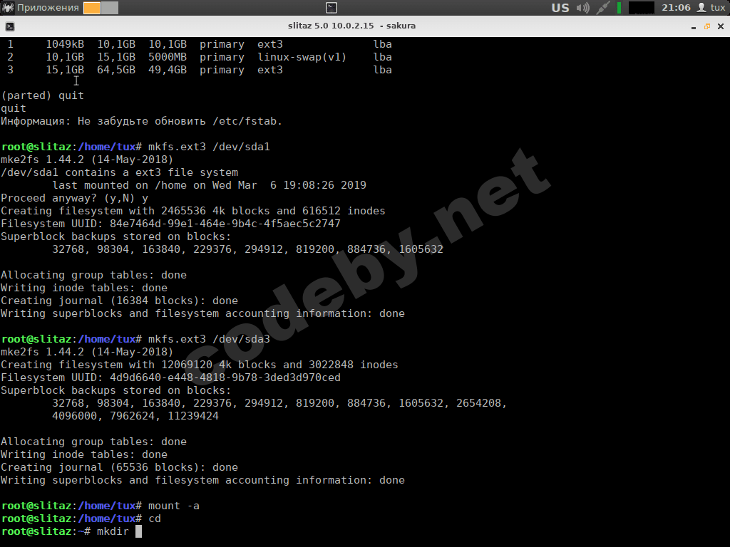 Теперь выходим из программы parted и форматируем ранее размеченные разделы диска используя "mkfs":