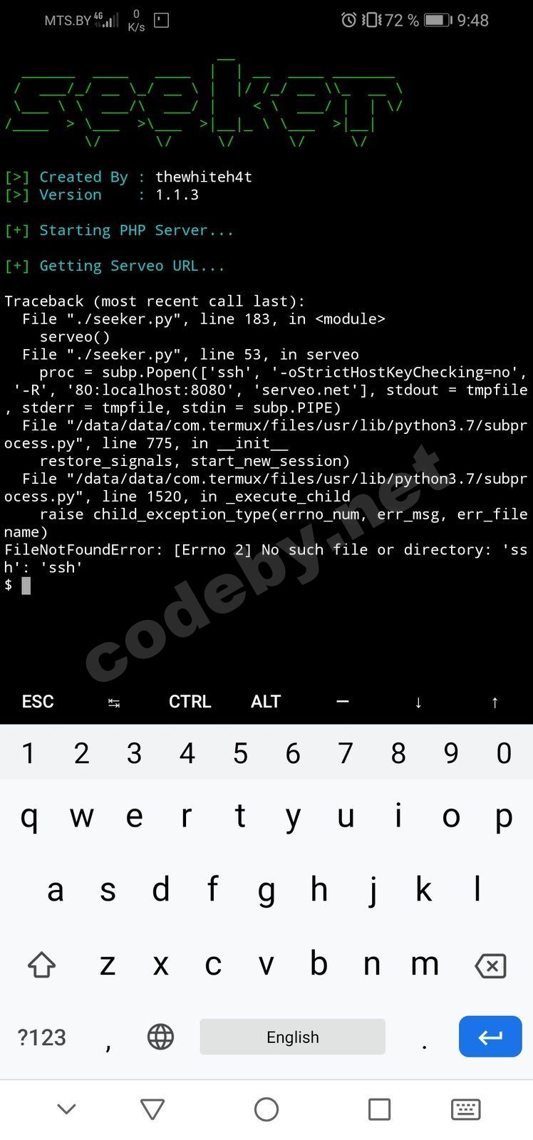 File "seeker.py", line 53, in serveo proc = subp.Popen(['ssh', '-oStrictHostKeyChecking=no', '-R', '80:localhost:8080', 'serveo.net'], stdout = tmpfile, stderr = tmpfile, stdin = subp.PIPE) File "/data/data/com.termux/files/usr/lib/python3.7/subprocess.py", line 775, in __init__