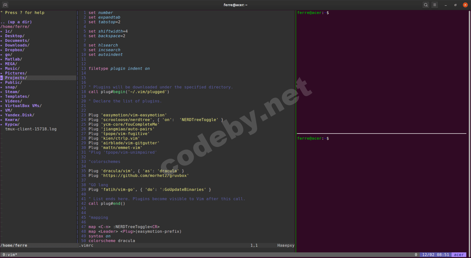 Vim + Tmux юзаю такую связку, вопрос каким образом можно настроить единую цветовую тему? Тема редактора vim в tmux отображается корректно, а вот сам tmux перевести на цветовую тему dracula не смог.