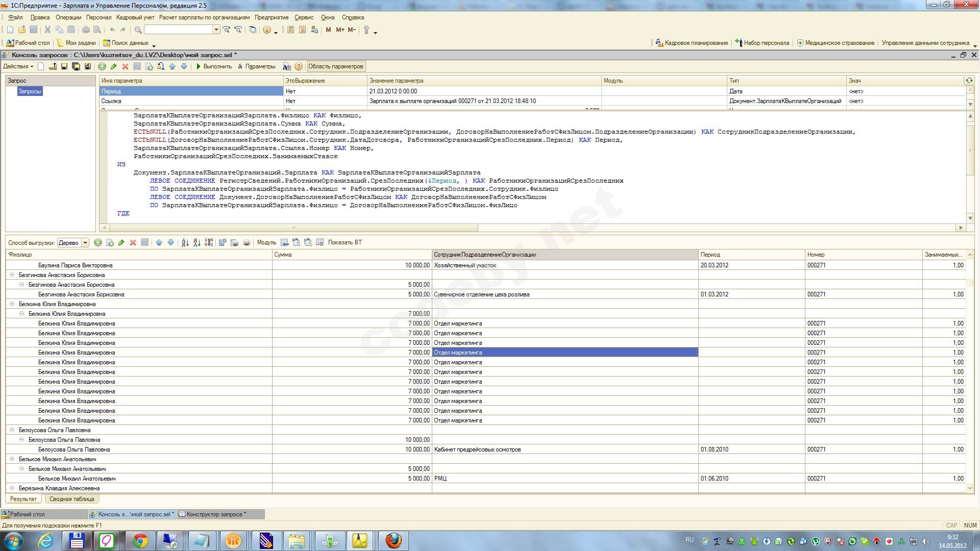 Делал внешнюю печатная форма к ЗУП к документу "Зарплата к выплате". Там впринципе всё просто. Формирует список людей в алфавитном порядке. Расчётчики сказали мне переделать её, чтобы группировалась по подразделениям. Но тут возникла трудность. Когда выполняется запрос люди дублируются из-за подразделений, т.к. данные о подразделениях берутся из регистра, а там у людей много подразделений (были перемещения) и он отображает в каждой строчке выплату денег с каждым из подразделений.