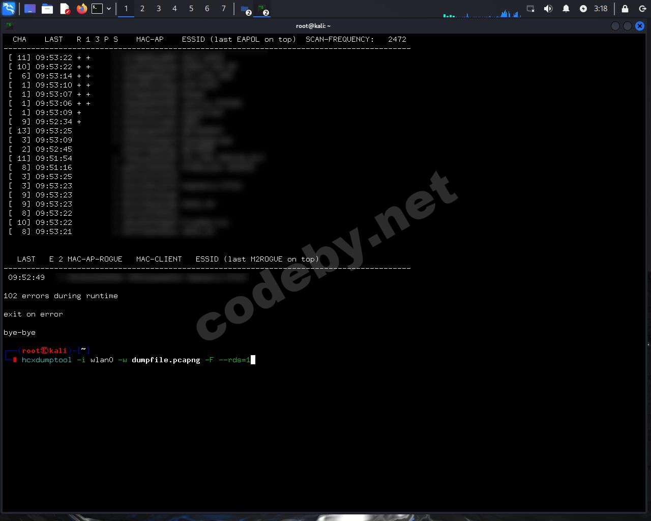 Возникла проблема с hcxdumptool (на данный момент установлена последняя версия), а именно - запускаю приложение, оно работает около 3-4 минут (в уроке сказано, что она должна проработать несколько дольше), затем завершается с сообщением "102 errors during runtime exit on error bye bye".