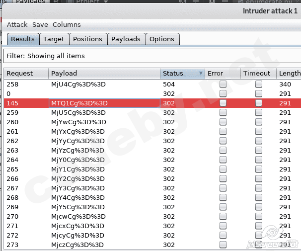 Что-то у меня на этапе брута восстановления пароля Burp после 250-го трая стал 302 на все запросы сыпать.