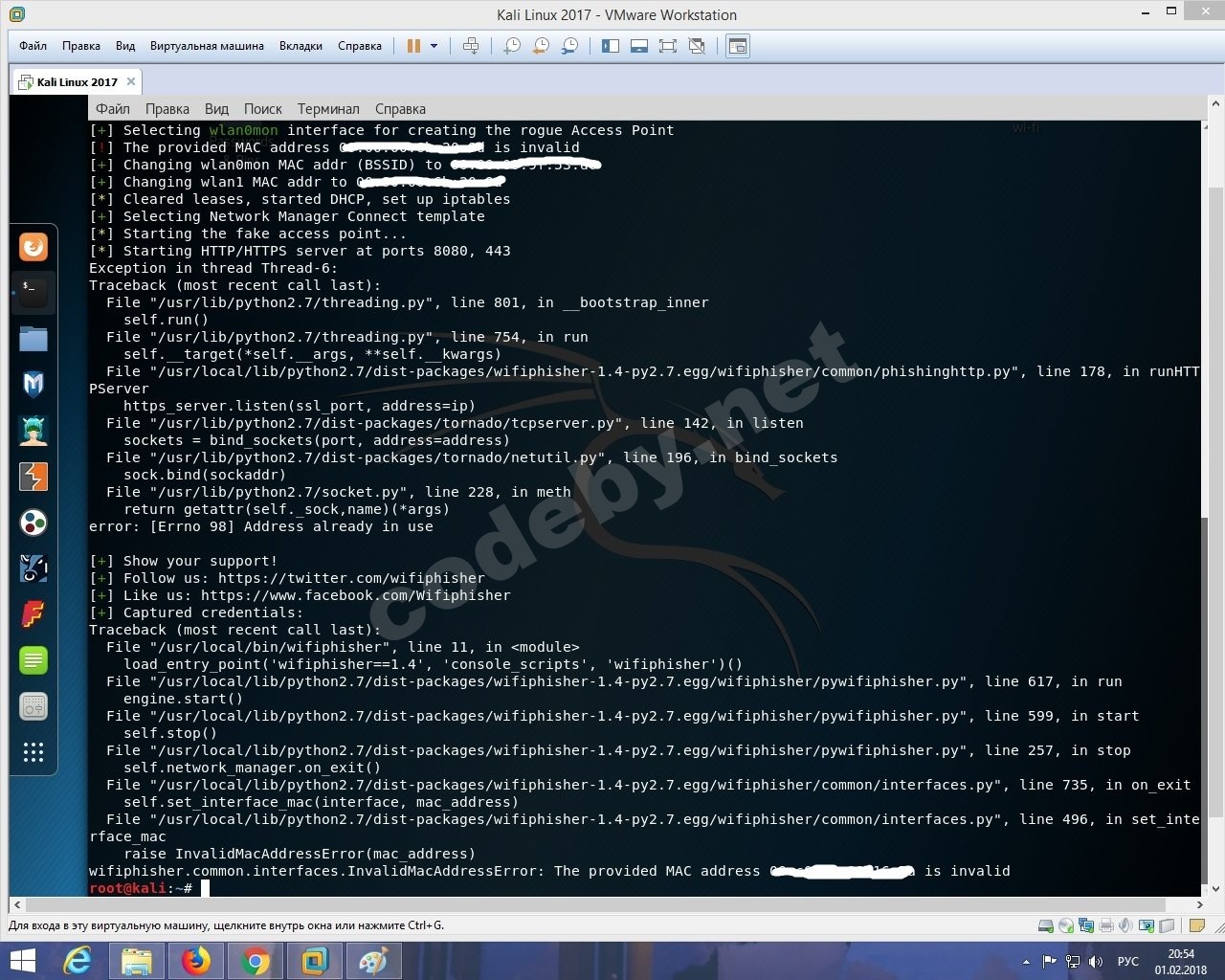 Проблема следующая - когда запускаю wifiphisher, независимо от количества WIFI плат, вырубаются все. Пробовала запускать через два USB адаптера (wlan1 и wlan2), но вырубаются все, в т.ч и wlan0. Естественно пропадает интернет, и до перезагрузки не могу его восстановить. Атакуемый компьютер так же без интернета. Не знаю как остановить программу.
