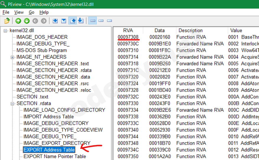 - Таблица экспортных адресов (Export Address Table) содержит RVAs, которые содержат RVA всех символов/функций в kernel32.dll;