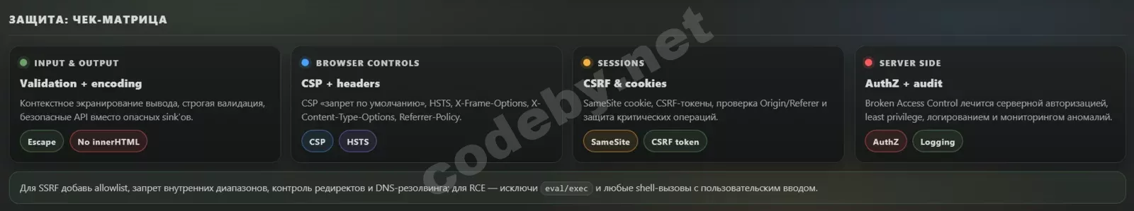 - CSP формируется от запрета ко всему - разрешения только точечные; отключены inline-скрипты, unsafe-eval.