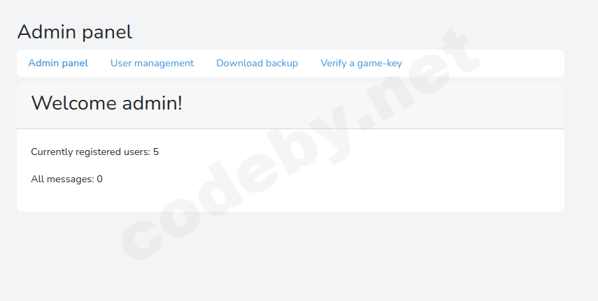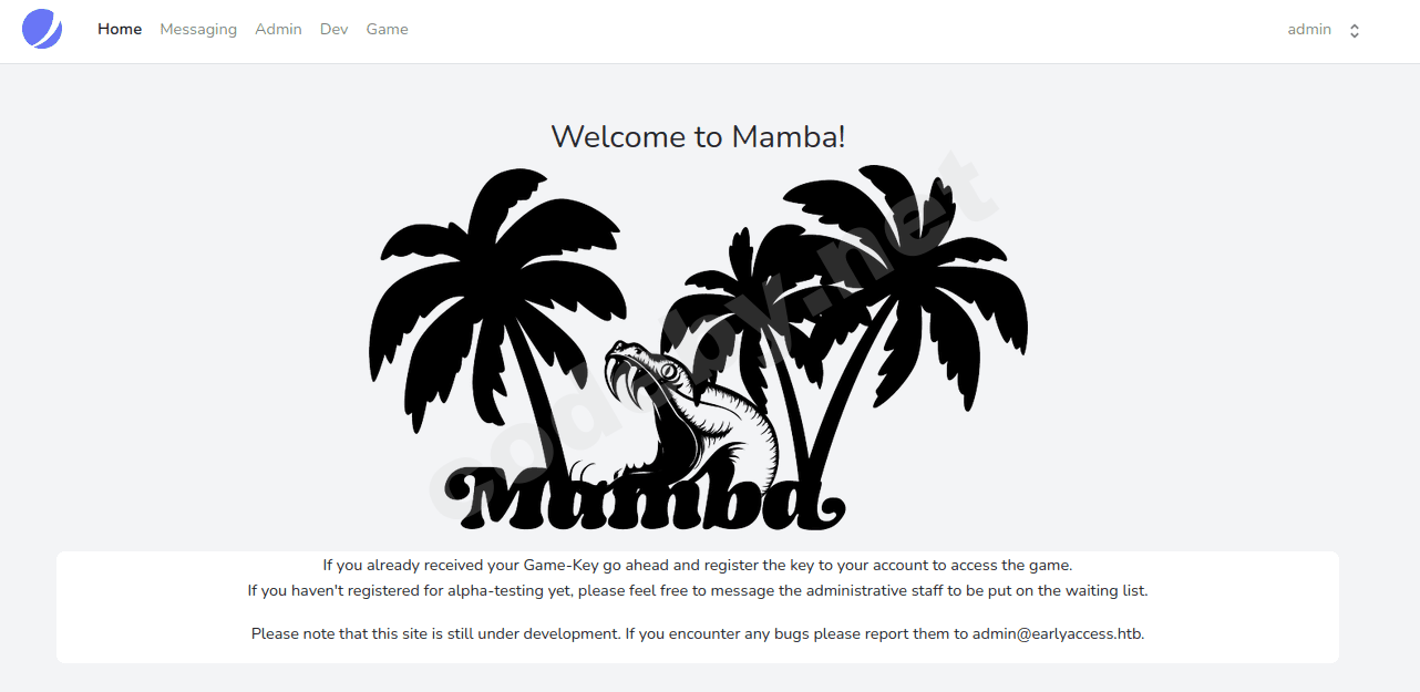 Теперь нам осталось зайти в аккаунт админа и проверить его домашнюю страницу на функционал.Итак, войдя на страницу, видим что мы admin, а также страницы: Admin, Dev, Game.