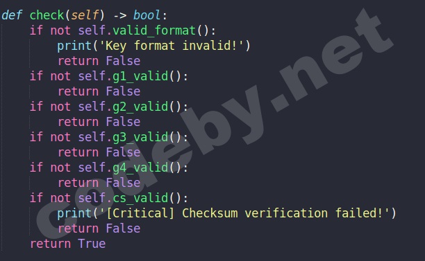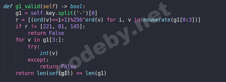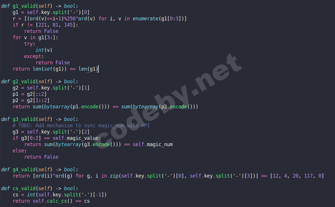 Далее у нас есть пять функций: g1_valid, g2_valid, g3_valid, g4_valid и cs_valid. Судя по их названиям кажется, что эти функции используются при проверке каждой группы отдельно, а это означает что если мы перестроим каждую функцию, мы сможем создать подходящий ключ.