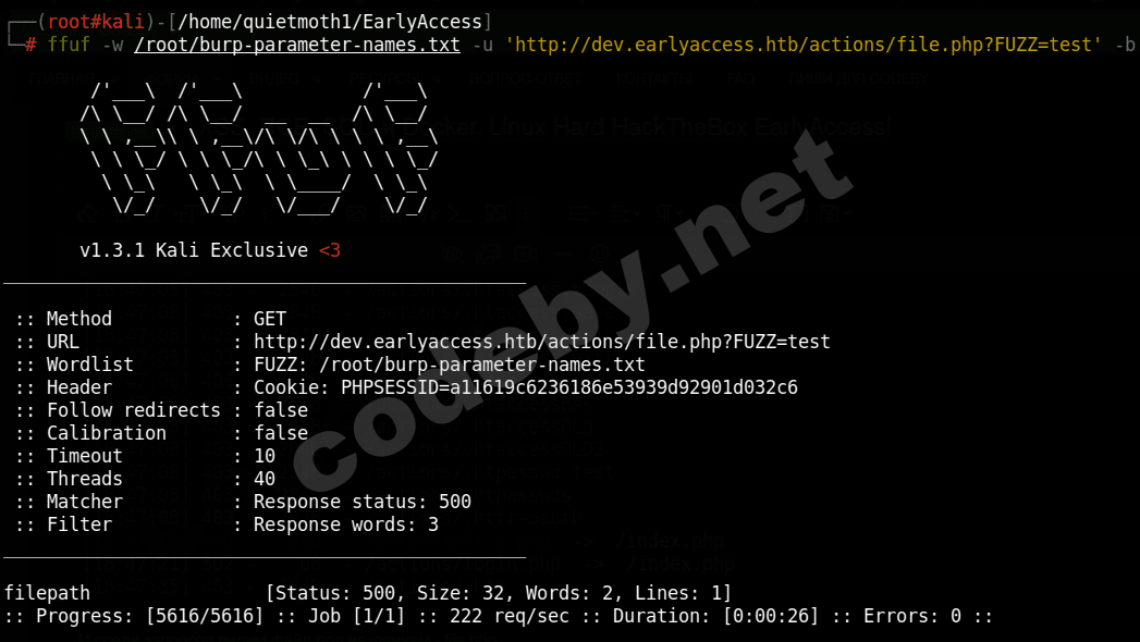 ffuf -w /root/burp-parameter-names.txt -u 'http://dev.earlyaccess.htb/actions/file.php?FUZZ=test' -b 'PHPSESSID=a11619c6236186e53939d92901d032c6' -mc 500 -fw 3И мы находим параметр filepath!