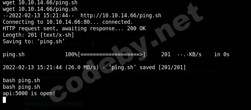 Предварительно загрузив его на эту машину и просканировав эти порты, мы видим что порт 5000 у хоста api - открыт!
