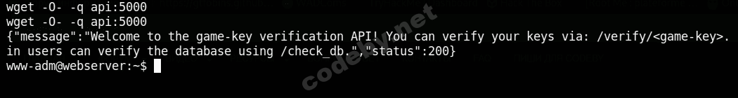 wget -O- -q api:5000И мы получаем ответ, где указана ссылка на /check_db, давайте посмотрим что в ней!