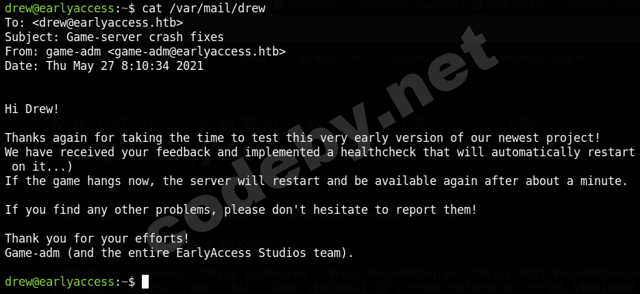 После длительного изучения этого сервера, я наткнулся на письмо в /var/mail/drew, а также у нас есть пользователь game-adm:Из письма мы видим пользователя game-tester и сервер game-server, про который говорится что он крашнулся.