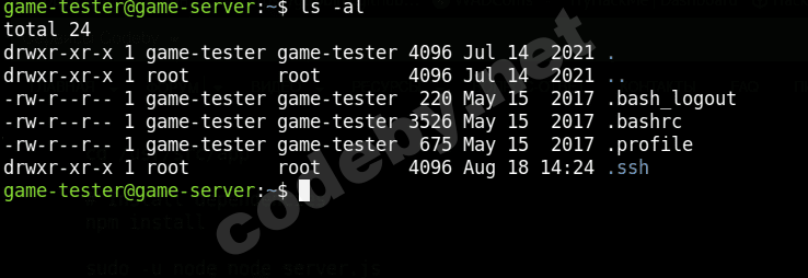 Нам следует запомнить содержимое этого скрипта и поискать дальнейшие подсказки внутри контейнера, а пока давайте попробуем подключиться к этому ip по ssh, используя имя пользователя game-tester.