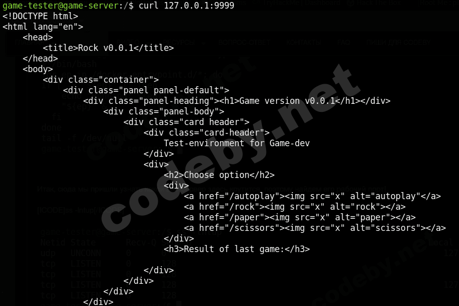 ss -lntupСреди портов мы видим порт 9999, давайте воспользуемся curl и выведем содержимое страницы: