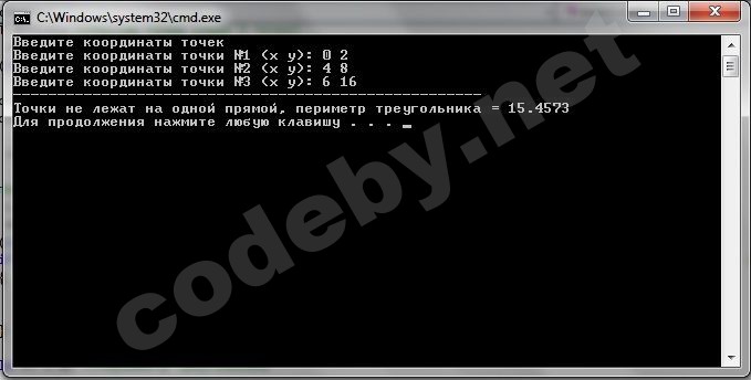 cout << "Точки не лежат на одной прямой, периметр треугольника = " << Pr << endl;