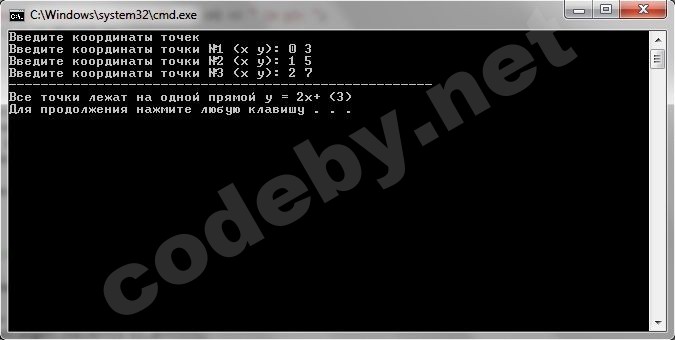} else cout << "Все точки лежат на одной прямой y = "<<L.k<<"x" << "+ (" <<L.b<<")"<< endl;