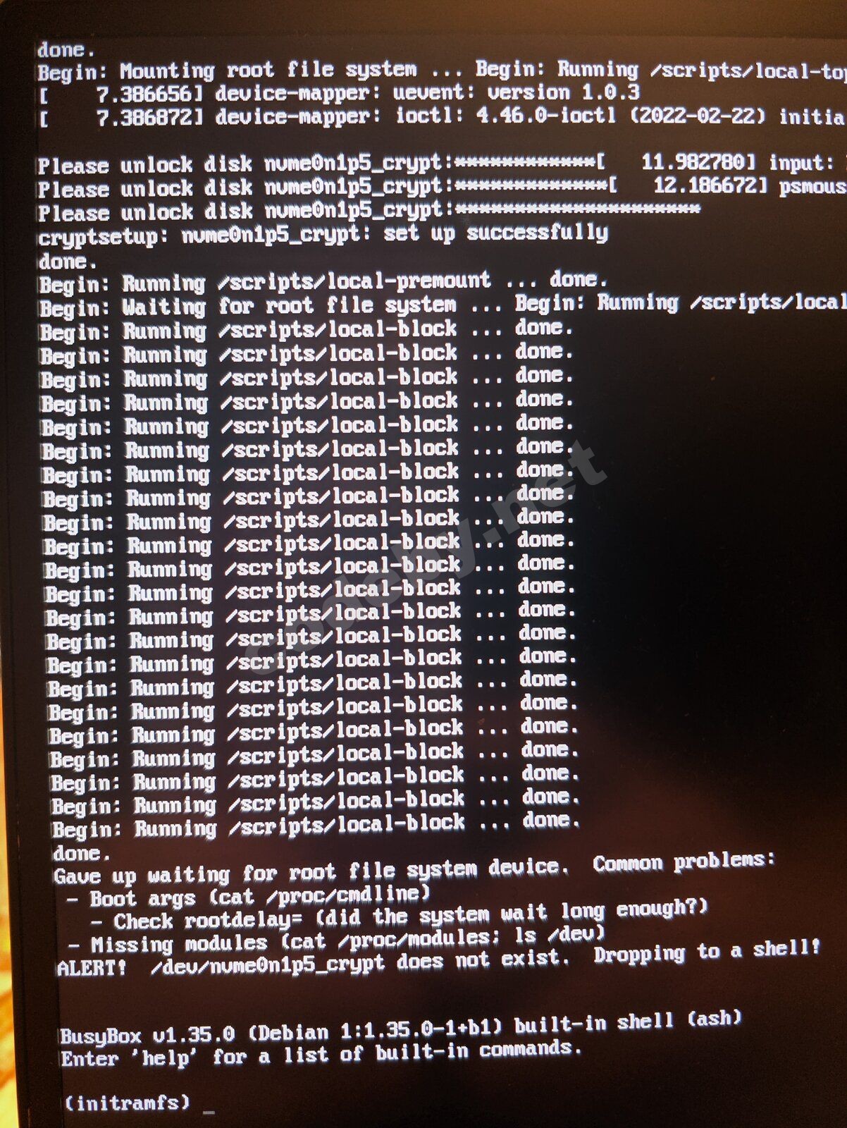 Но, как я понимаю, вышеизложенное относится к системе без использования LVM и/или шифрования LUKS. Ибо не получается что-то: пишет мне, мол, нет такого диска nvme0n1p5_crypt. Пробовал просто как nvme0n1p5 - то же самое. (при установке разделы были проименованы именно как nvme0n1pX а не как sdaX)